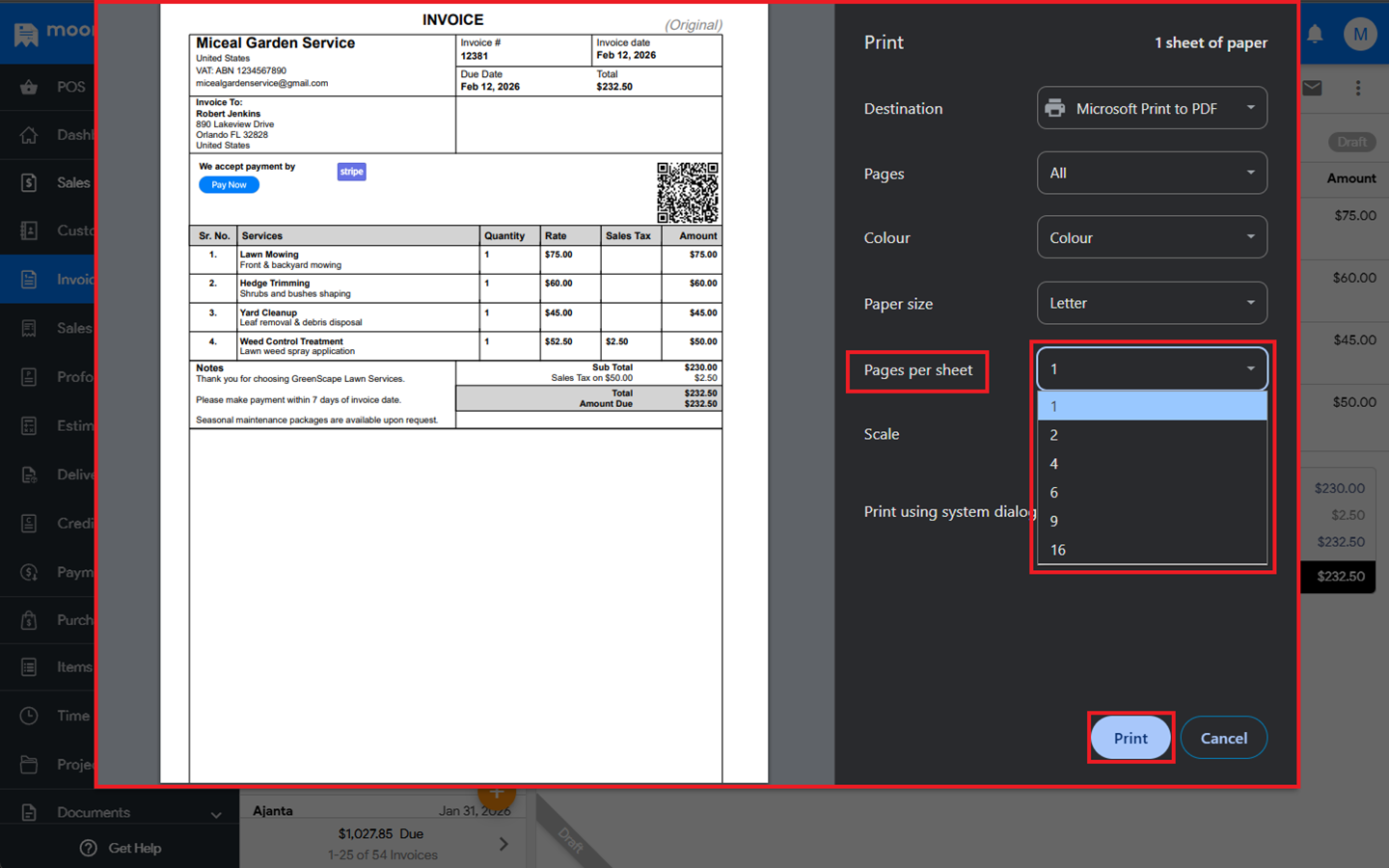 - Next, navigate to Sales ➜ Invoice and open the existing invoice. Click Print, then under Pages per Sheet, select your preferred option.