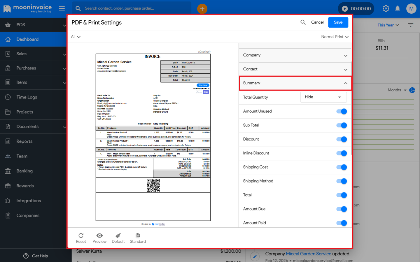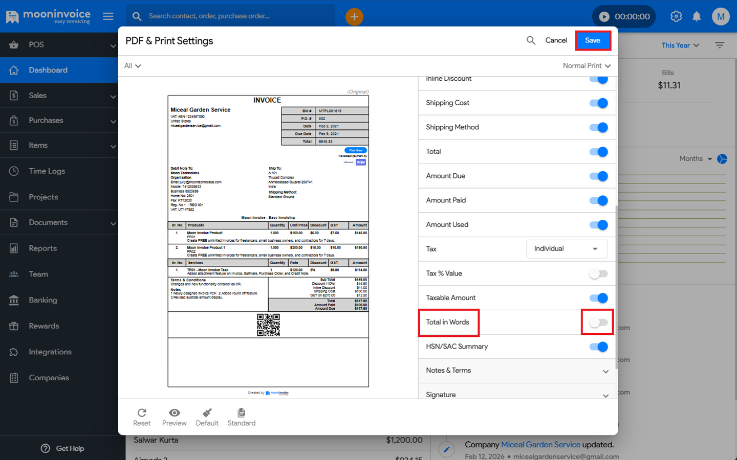 You can easily enable the Total in Words option in the PDF in Moon Invoice by following the steps below.