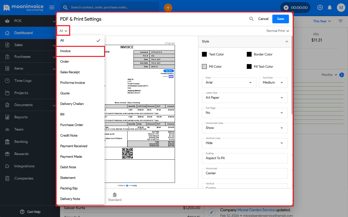 - Navigate to Settings → PDF & Print Settings → now choose invoice from the top left corner.