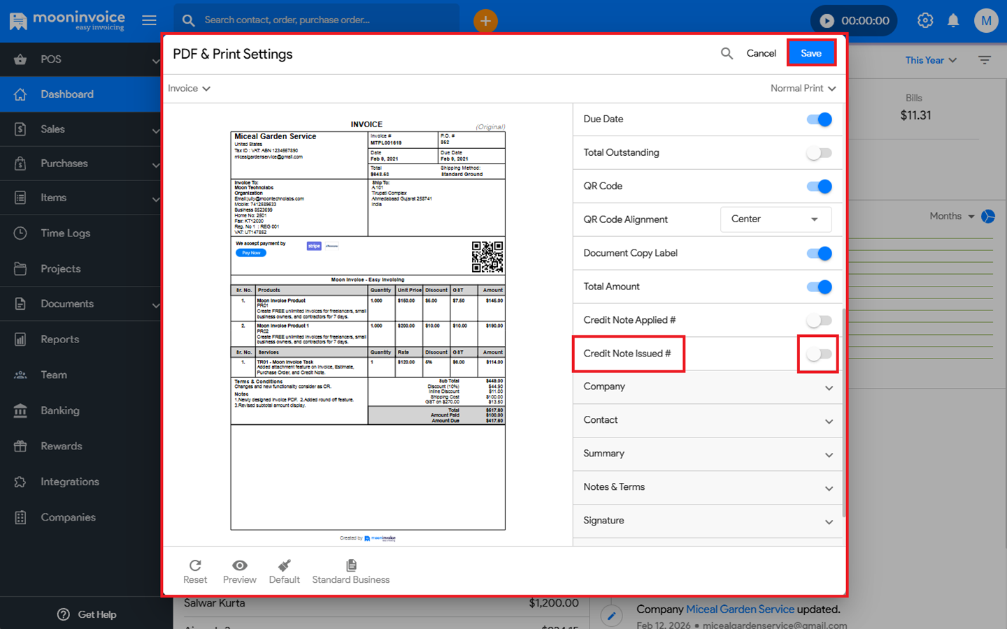 - Once it’s enabled, the Credit Note Issued number will appear in the Invoice PDF.