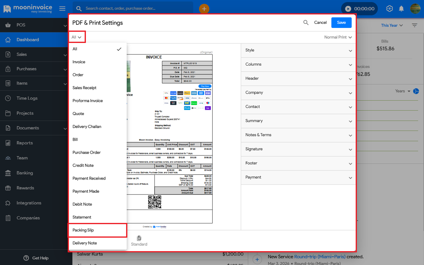 - Navigate to Settings ➜ PDF & Print Settings, then choose Packing Slip from the top-left corner