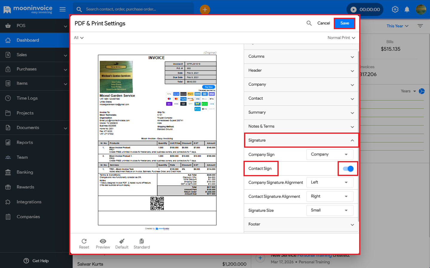 You can easily disable the contact sign option in the PDF in Moon Invoice by following the steps below.
