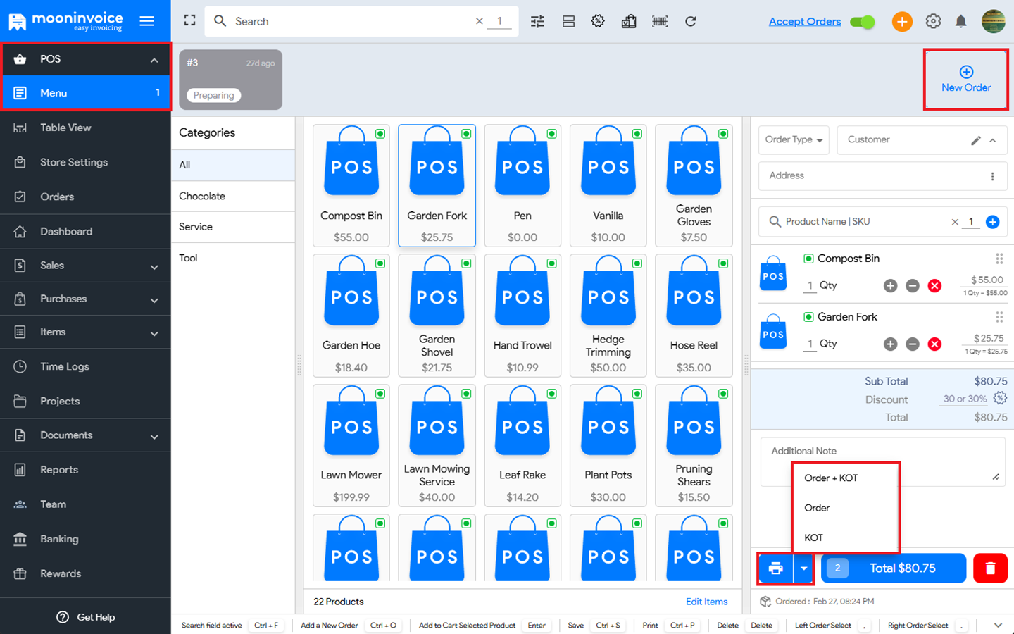 There are basically 3 types of order printing options present under Moon POS