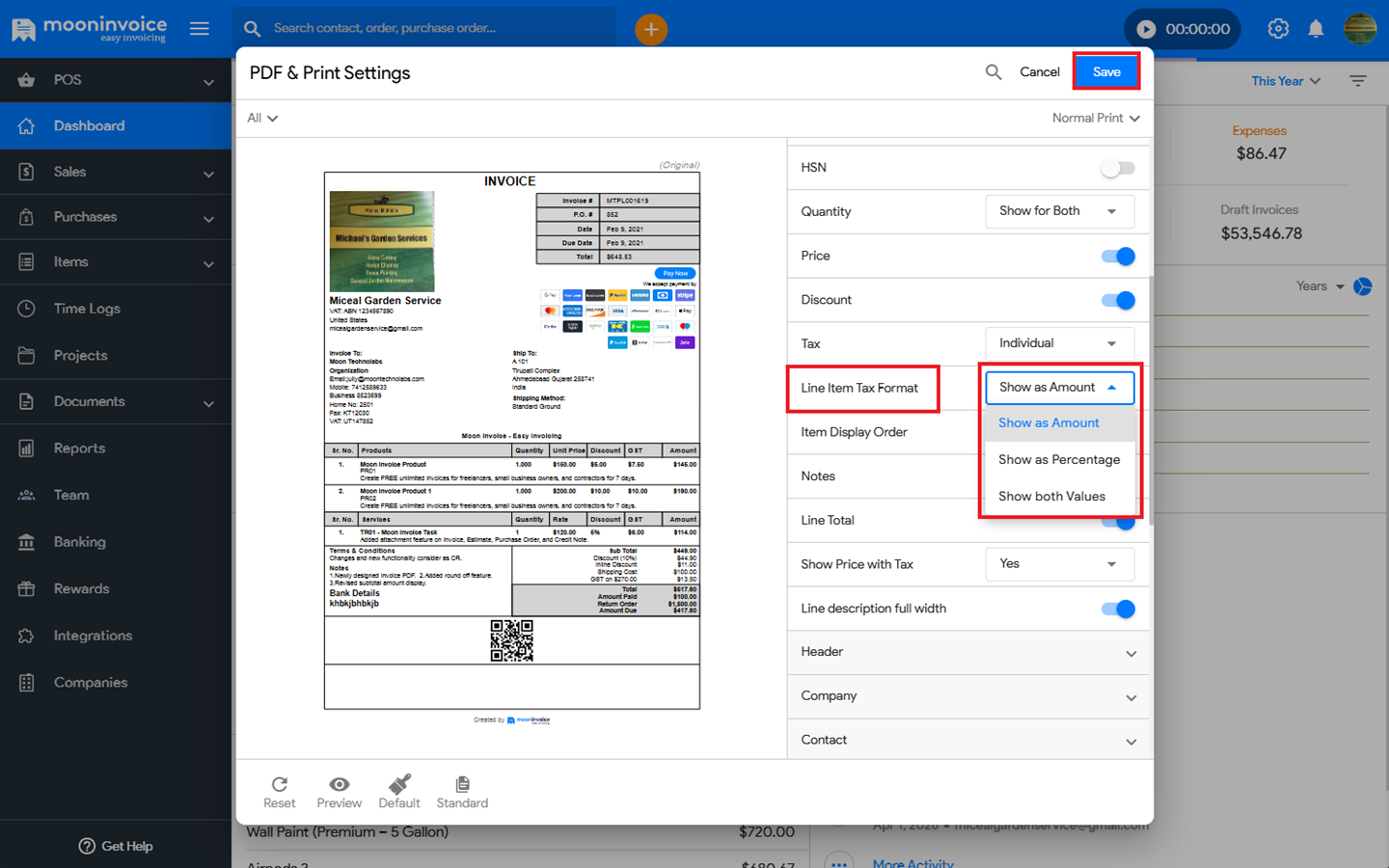 You can easily select different Line Item Tax format options in PDF in Moon Invoice.