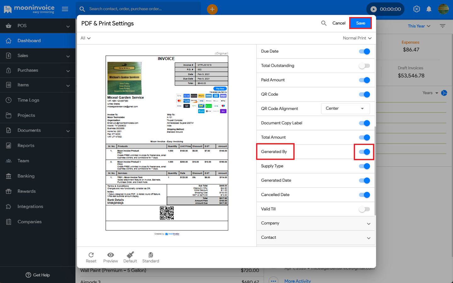 You can easily disable the Generated By option in the PDF in Moon Invoice by following the steps below.