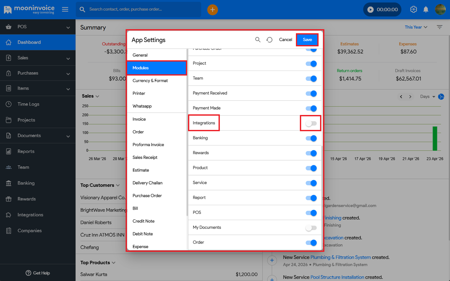 You can easily enable the integrations module in Moon Invoice by following the steps below.