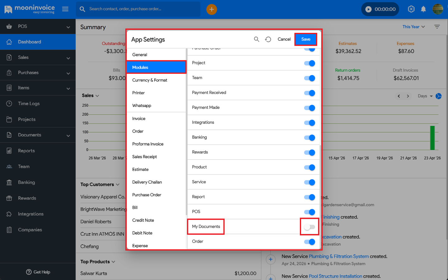You can easily turn on the my documents option in Moon Invoice by following the steps below.